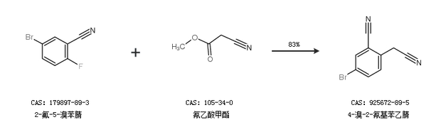 1.通过2-氟-5-溴苯腈和氰乙酸甲酯合成4-溴-2-氰基苯乙腈,收率约83%;