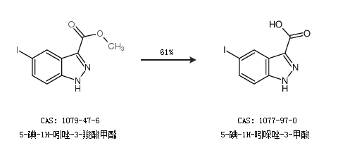 1.通过5-碘-1H-吲唑-3-羧酸甲酯合成5-碘-1H-吲哚唑-3-甲酸,收率约61%;