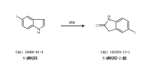 2.通过5-碘吲哚合成5-碘吲哚-2-酮,收率约65%;