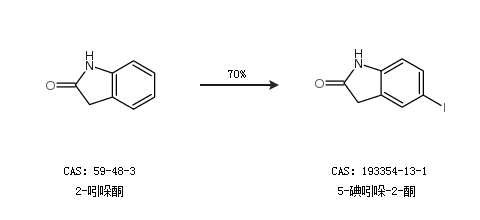 1.通过2-吲哚酮合成5-碘吲哚-2-酮,收率约70%;