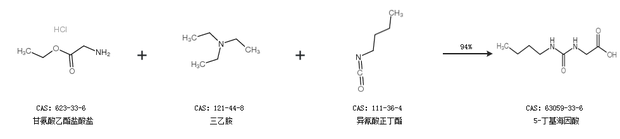 1.通过甘氨酸乙酯盐酸盐、三乙胺和异氰酸正丁酯合成5-丁基海因酸,收率约94%;