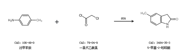 2.通过对甲苯胺和一氯代乙酰氯合成5-甲基-2-吲哚酮,收率约85%;