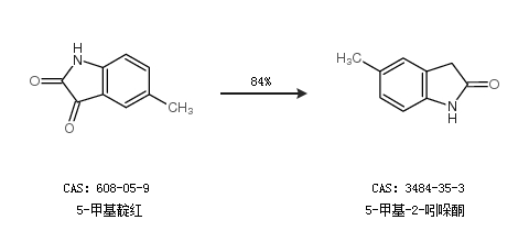 1.通过5-甲基靛红合成5-甲基-2-吲哚酮,收率约84%;