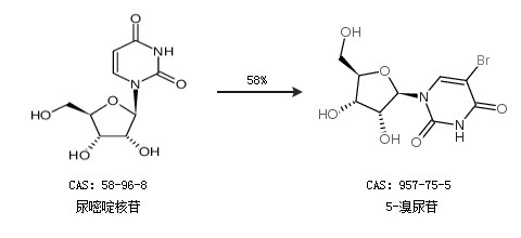 2.通过尿嘧啶核苷合成5-溴尿苷,收率约58%;