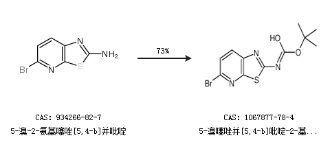 1.通过5-溴-2-氨基噻唑[5,4-b]并吡啶合成5-溴噻唑并[5,4-b]吡啶-2-基氨基甲酸叔丁酯,收率约73%;