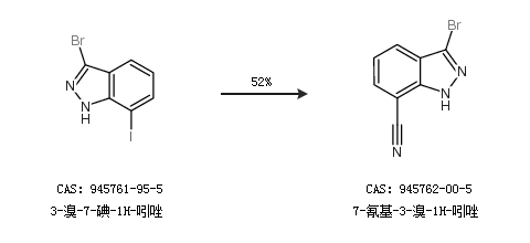 2.通过3-溴-7-碘-1H-吲唑合成7-氰基-3-溴-1H-吲唑,收率约52%;