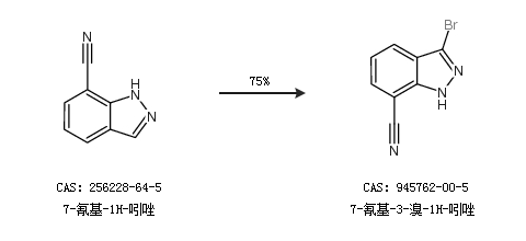 1.通过7-氰基-1H-吲唑合成7-氰基-3-溴-1H-吲唑,收率约75%;
