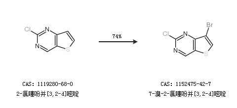 1.通过2-氯噻吩并[3,2-d]嘧啶合成7-溴-2-氯噻吩并[3,2-d]嘧啶,收率约74%;
