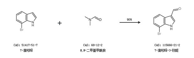 1.通过7-溴吲哚和N,N-二甲基甲酰胺合成7-溴吲哚-3-羧醛,收率约90%;