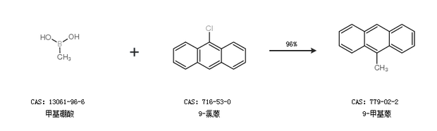 1.通过甲基硼酸和9-氯蒽合成9-甲基蒽,收率约96%;