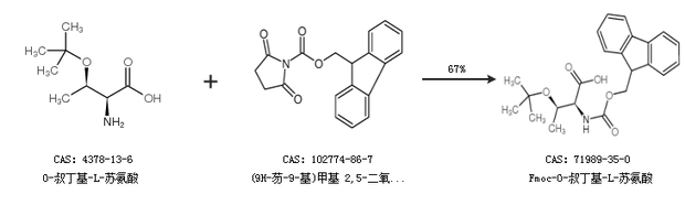 1.通过O-叔丁基-L-苏氨酸和(9H-芴-9-基)甲基 2,5-二氧代吡咯烷-1-羧酸合成Fmoc-O-叔丁基-L-苏氨酸,收率约67%;