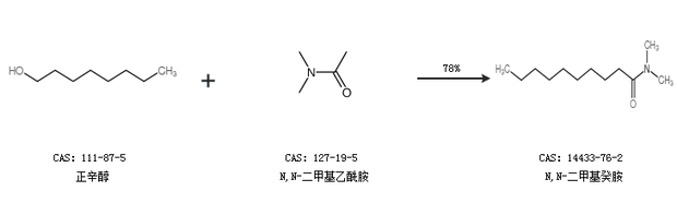1.通过正辛醇和N,N-二甲基乙酰胺合成N,N-二甲基癸胺,收率约78%;