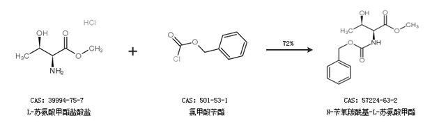 1.通过L-苏氨酸甲酯盐酸盐和氯甲酸苄酯合成N-苄氧羰酰基-L-苏氨酸甲酯,收率约72%;