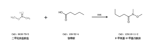 1.通过二甲羟胺盐酸盐和缬草酸合成N-甲氧基-N-甲基戊酰胺,收率约84%;