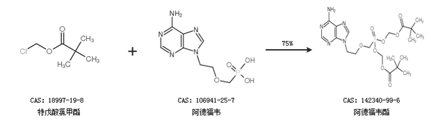 1.通过特戊酸氯甲酯和阿德福韦合成阿德福韦酯,收率约75%;