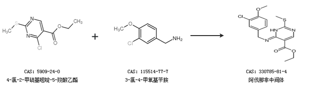 1.通过4-氯-2-甲硫基嘧啶-5-羧酸乙酯和3-氯-4-甲氧基苄胺合成阿伐那非中间体