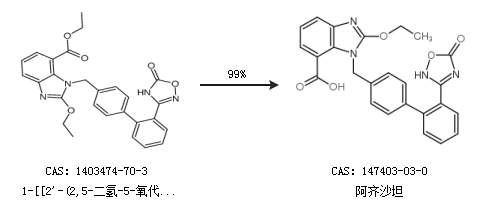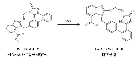 1.通过1-[[2-(2,5-二氢-5-氧代-1,2,4-噁二唑-3-基)[1,1-联苯]-4-基]甲基]-2-乙氧基-1H-苯并咪唑-7-羧酸甲酯合成阿齐沙坦,收率约95%;
