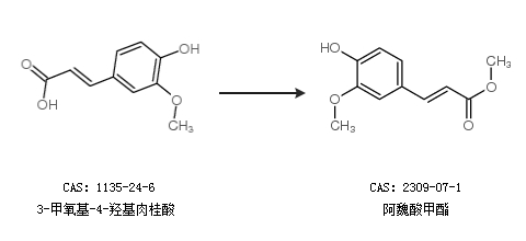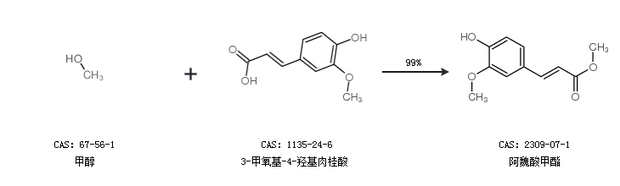 1.通过甲醇和3-甲氧基-4-羟基肉桂酸合成阿魏酸甲酯,收率约99%;
