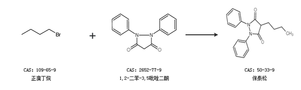 2.通过正溴丁烷和1,2-二苯-3,5吡唑二酮合成保泰松
