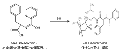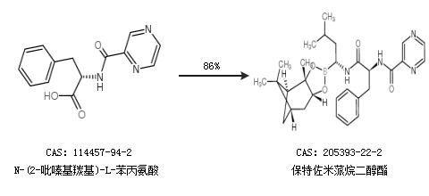 2.通过N-(2-吡嗪基羰基)-L-苯丙氨酸合成保特佐米蒎烷二醇酯,收率约86%;