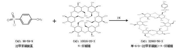 1.通过对甲苯磺酰氯和α-环糊精合成单-6-O-(对甲苯磺酰)-α-环糊精,收率约25%;