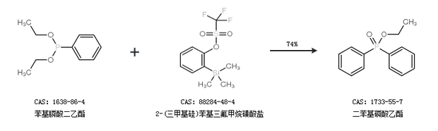 2.通过苯基膦酸二乙酯和2-(三甲基硅)苯基三氟甲烷磺酸盐合成二苯基磷酸乙酯,收率约74%;