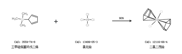 2.通过三甲硅烷基环戊二烯和氯化铪合成二氯二茂铪,收率约90%;