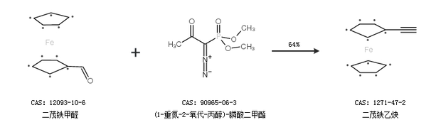2.通过二茂铁甲醛和(1-重氮-2-氧代-丙醇)-膦酸二甲酯合成二茂铁乙炔,收率约64%;