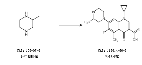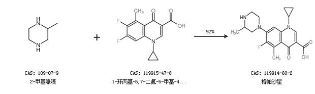 2.通过2-甲基哌嗪和1-环丙基-6,7-二氟-5-甲基-4-氧代-3-喹啉羧酸合成格帕沙星,收率约92%;