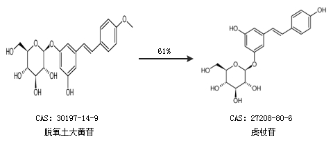 1.通过脱氧土大黄苷合成虎杖苷,收率约61%;