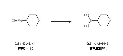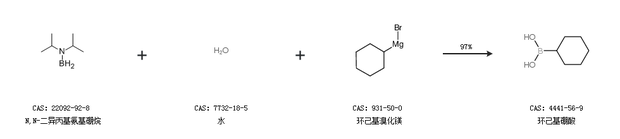 1.通过N,N-二异丙基氨基硼烷、水和环己基溴化镁合成环己基硼酸,收率约97%;