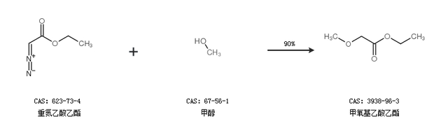 2.通过重氮乙酸乙酯和甲醇合成甲氧基乙酸乙酯,收率约90%;