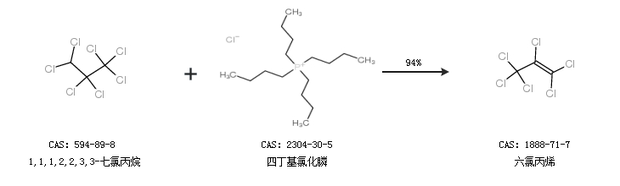 2.通过1,1,1,2,2,3,3-七氯丙烷和四丁基氯化膦合成六氯丙烯,收率约94%;