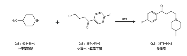1.通过4-甲基哌啶和4-氯-4''-氟苯丁酮合成美哌隆,收率约84%;
