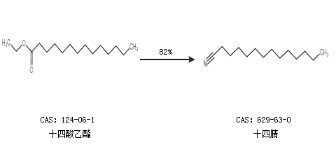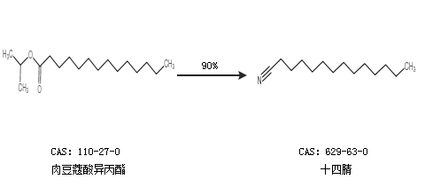 1.通过肉豆蔻酸异丙酯合成十四腈,收率约90%;