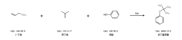 2.通过1-丁烯、异丁烯和苯酚合成叔丁基苯醚,收率约50%;