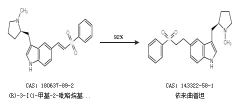 2.通过(R)-3-[(1-甲基-2-吡咯烷基)甲基]-5-[2-(苯磺酰基)乙烯基]-1H-吲哚合成依来曲普坦,收率约92%;