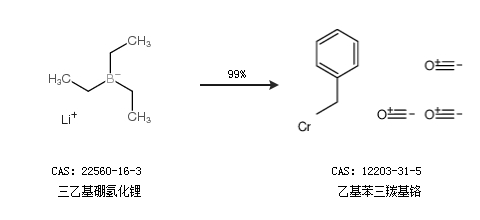 1.通过三乙基硼氢化锂合成乙基苯三羰基铬,收率约99%;