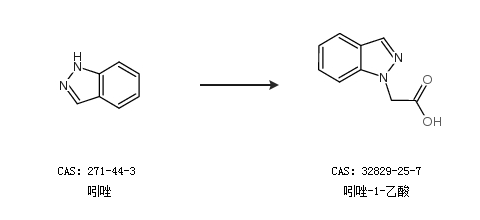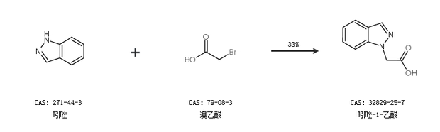 1.通过吲唑和溴乙酸合成吲唑-1-乙酸,收率约33%;