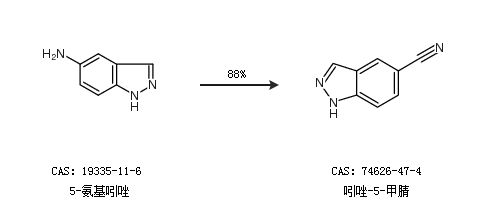 2.通过5-氨基吲唑合成吲唑-5-甲腈,收率约88%;