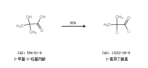 1.通过2-甲基-2-羟基丙酸合成2-氯异丁酰氯,收率约82%;