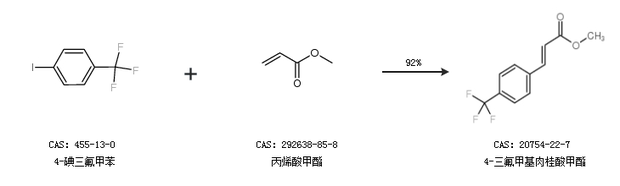 1.通过4-碘三氟甲苯和丙烯酸甲酯合成4-三氟甲基肉桂酸甲酯,收率约92%;