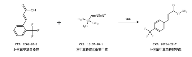 2.通过2-三氟甲基肉桂酸和三甲基硅烷化重氮甲烷合成4-三氟甲基肉桂酸甲酯,收率约96%;
