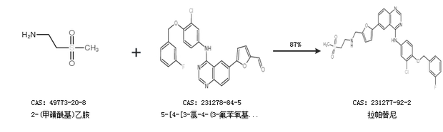1.通过2-(甲磺酰基)乙胺和5-[4-[3-氯-4-(3-氟苯氧基)苯胺基]-6-喹唑啉基]呋喃-2-甲醛合成拉帕替尼,收率约87%;