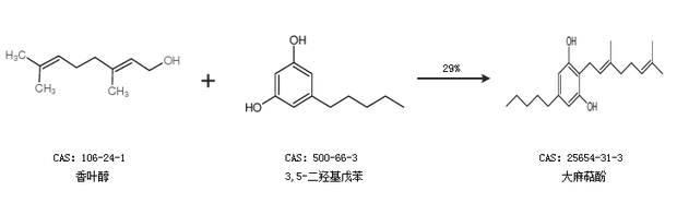 1.通过香叶醇和3,5-二羟基戊苯合成大麻萜酚,收率约29%;