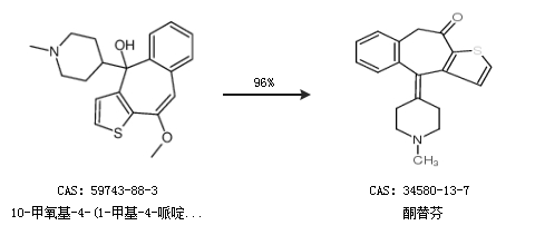 1.通过10-甲氧基-4-(1-甲基-4-哌啶基)-4H-苯并[4,5]环庚三烯并[1,2-B]噻吩-4-醇合成酮替芬,收率约96%;