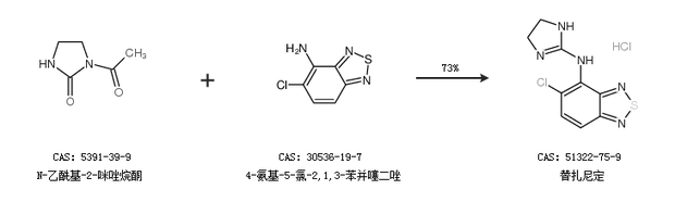 1.通过N-乙酰基-2-咪唑烷酮和4-氨基-5-氯-2,1,3-苯并噻二唑合成替扎尼定,收率约73%;