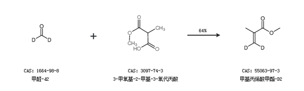 1.通过甲醛-d2和3-甲氧基-2-甲基-3-氧代丙酸合成甲基丙烯酸甲酯-D2,收率约64%;