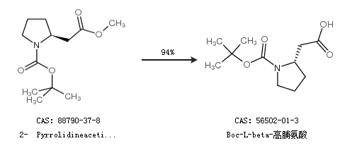 1.通过2-?Pyrrolidineacetic acid, 1-?[(1,?1-?dimethylethoxy)?carbonyl]?-?, methyl ester, (2S)?-合成Boc-L-beta-高脯氨酸,收率约94%;