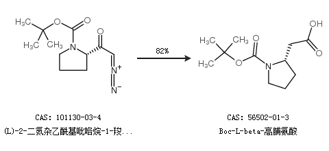 2.通过(L)-2-二氮杂乙酰基吡咯烷-1-羧酸叔丁酯合成Boc-L-beta-高脯氨酸,收率约82%;